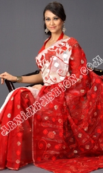 White & Red Jamdani saree with gorgeous embroidery work on body, Paar and Aachol. Maching work Red Color Dupion silk Blouse Piece will comes with sharee, we will Worldwide Delivery via FedEx / DHL / TNT / UPS
